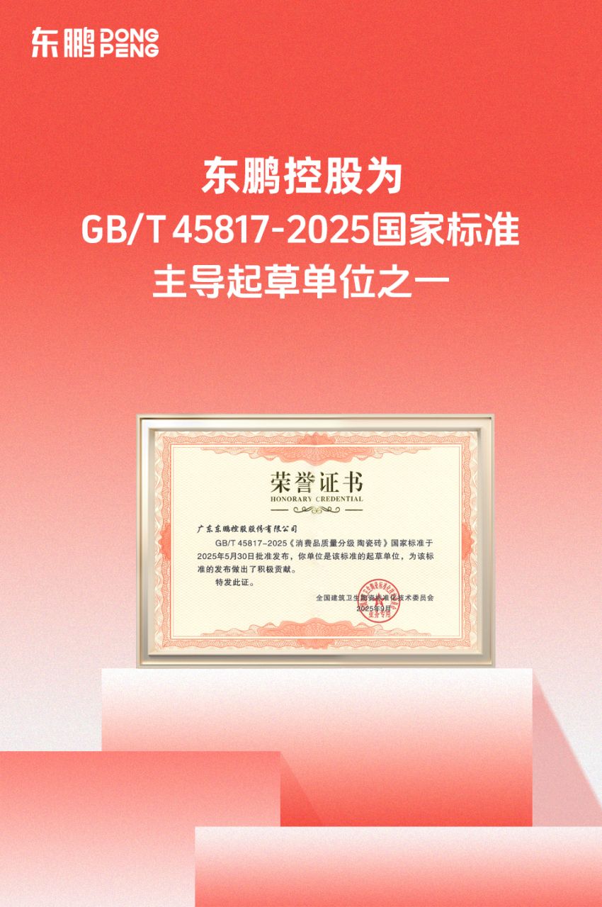 10月17日,由中国建筑卫生陶瓷协会主办的“2025建筑陶瓷新质生产力发展大会”隆重举行。大会围绕新国标进行标准解读,并发布了首批质量检测结果。作为标准的主导起草单位之一,东鹏控股深度参与了标准起草与验证全过程;其所检项目符合GB/T 45817-2025标准中AAAAA级的要求,成为首批通过陶瓷砖新国标5A标准产品检测的企业。