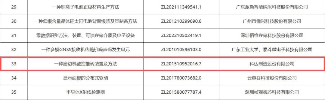 近日,广东省市场监督管理局(知识产权局)网站公布了第十一届广东专利奖评选结果,科达制造申报的“一种磨边机数控推砖装置及方法”专利技术荣获广东专利优秀奖。