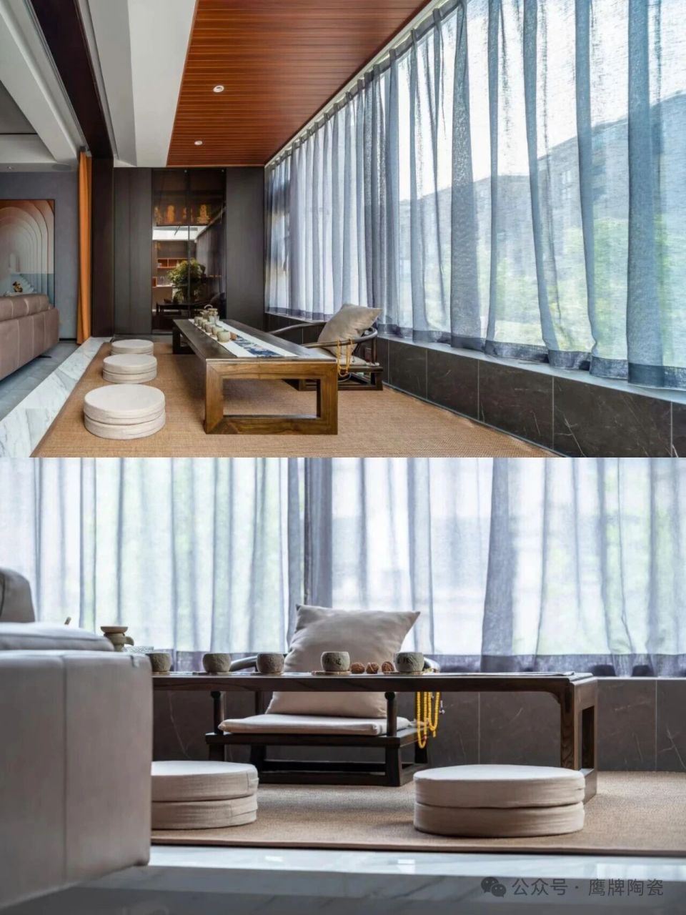 细节之处:吧台与茶桌的设计,既是传统与现代的碰撞,也提供了更多生活方式的选择,无论是闲暇时光坐下来小酌一杯,亦或是席地而坐品一杯香茗,都能令人暂时忘却城市的繁杂与喧嚣,独享宁静空间